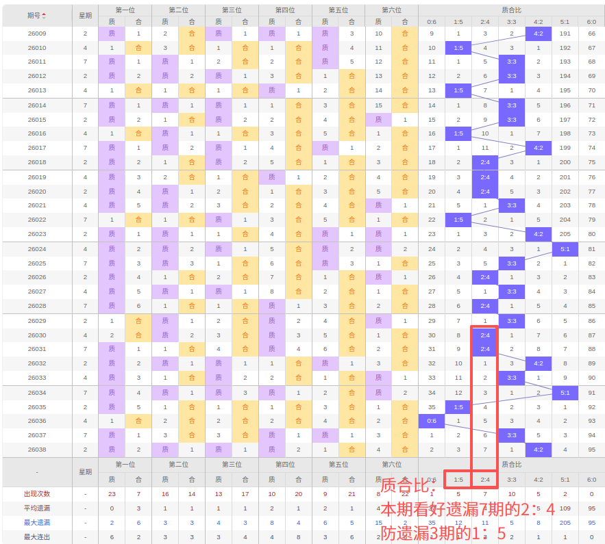 上期质合比:4:2,近10期质合比出现情况:3:3、2:4、2:4、4:2、3:3、5:1、1:5、0:6、3:3、4:2,最近10期出3期3:3,出现2期4:2,出现2期2:4,出现1期5:1,出现1期1:5,出现0期6:0,出现1期0:6,根据近10期规律本期看好遗漏7期出2:4,防遗漏3期1:5,综上所述推荐质合比推荐:1:5,重点关注:2:4。