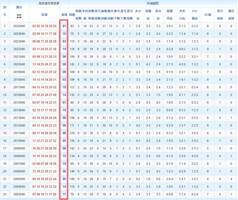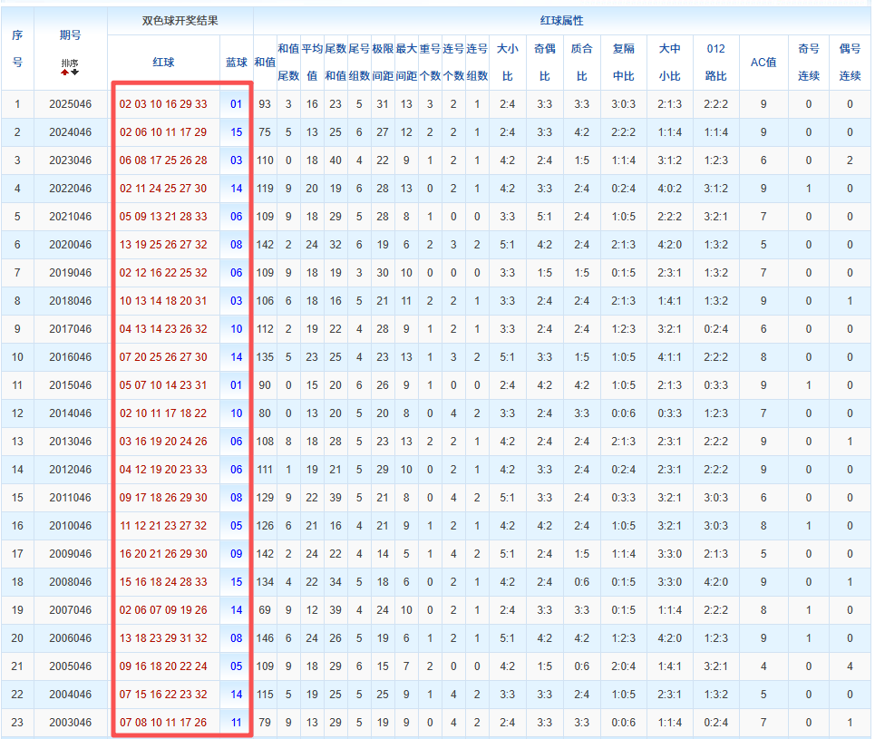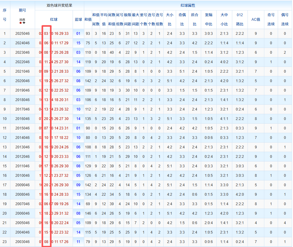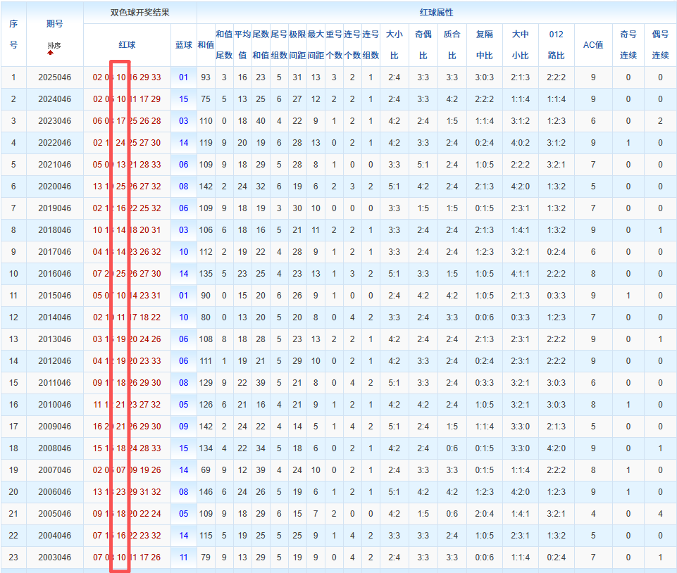通过观察,我发现双色球往年同期的开奖数据与本期号码之间存在显著关联。具体来说,在红球中,从第一位至第六位,通常会有约4个位置上的数字与往年同期相同位置的号码一致;而蓝球号码中,也有多期开奖结果直接包含了往年同期的数字。因此,我们可以借助往年同期各位置上的号码,作为分析本期开奖情况的重要依据。在此基础上,还可结合往年同期的其他相关条件,进行综合性的号码组合推荐。