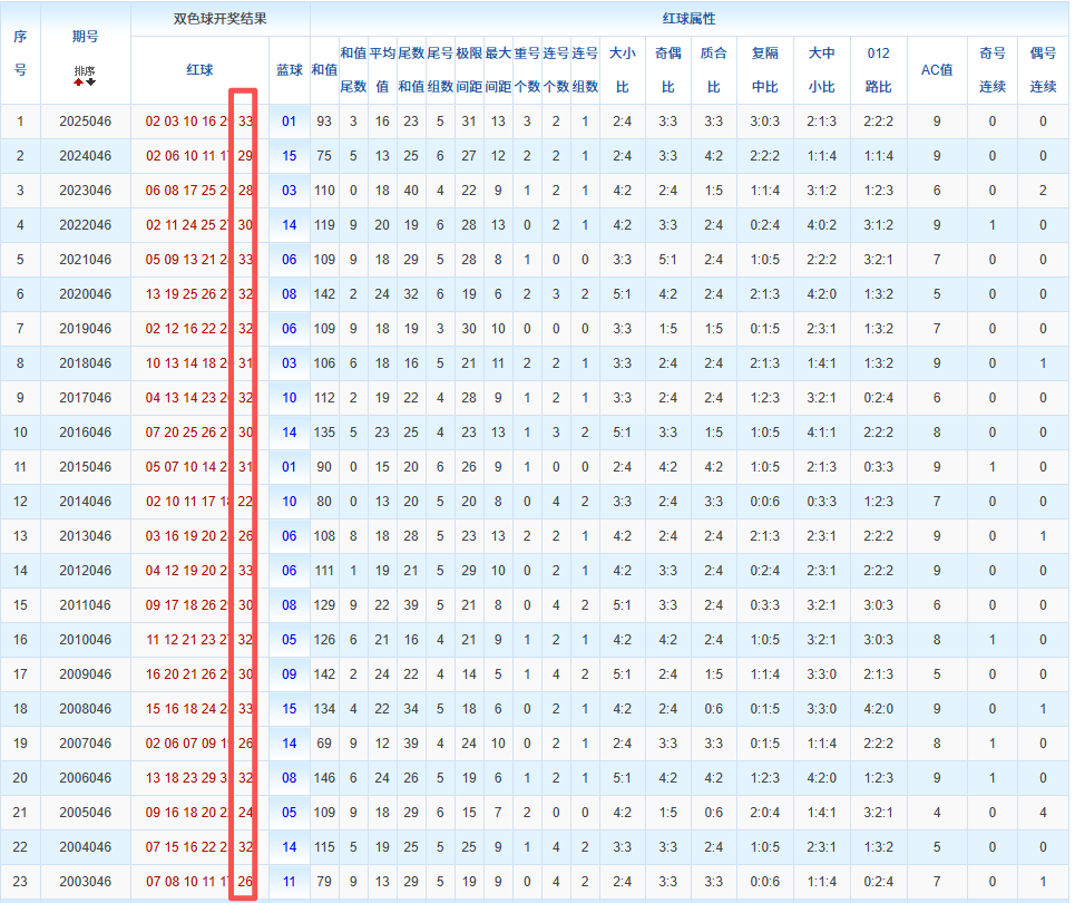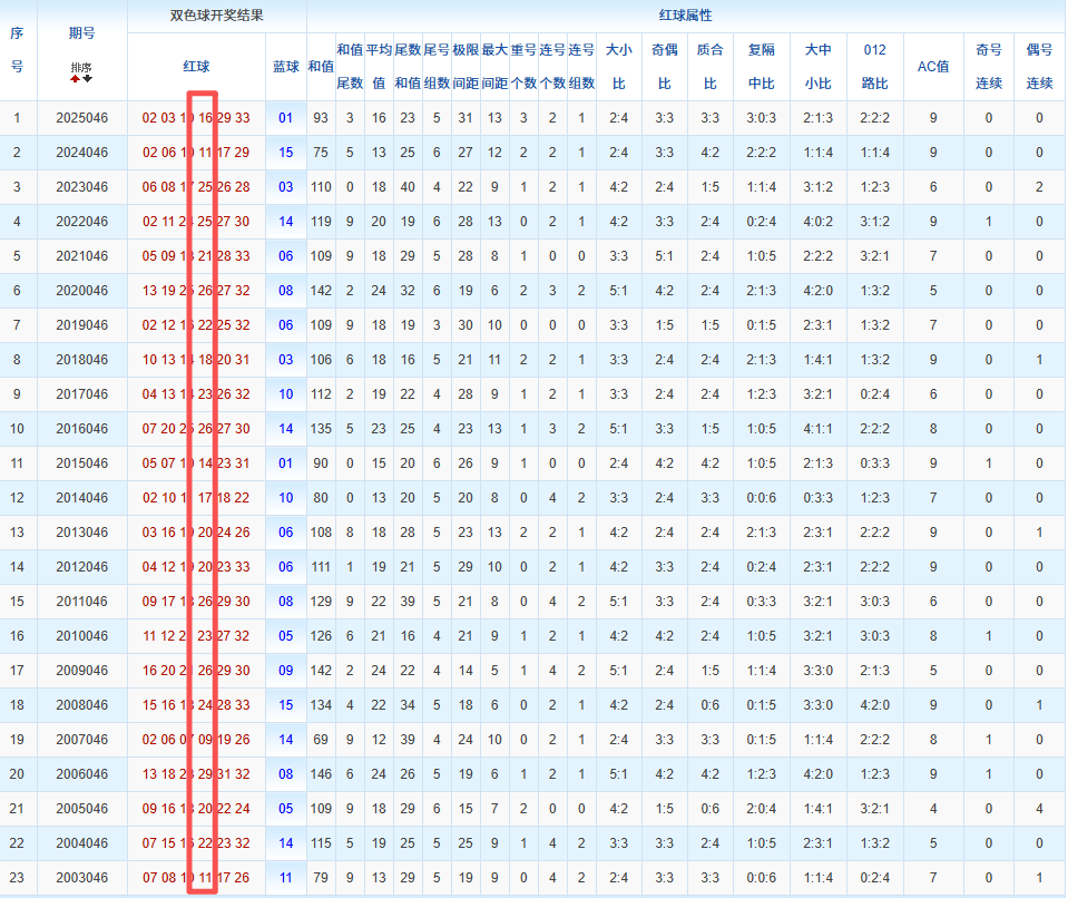 往年同期中选取出现次数靠前的数作为我们的分析对象,其数据有:26 16 32 23等