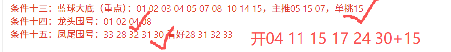 条件十三:蓝球大底(重点):01 02 03 04 07 10 11 12 13 14 15,主推**(会员解锁),单挑**(会员解锁)