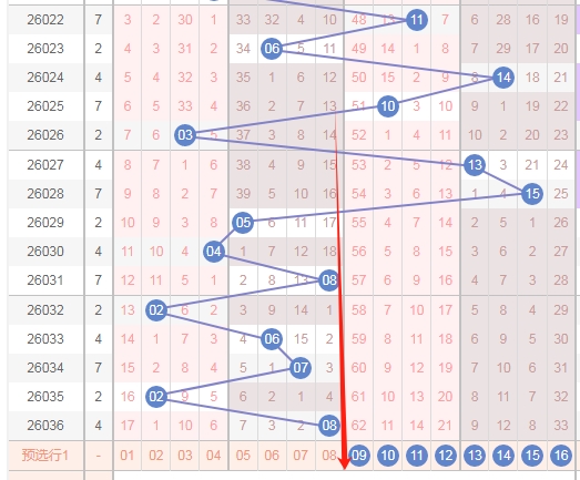 上图是福彩双色球蓝球开奖号码走势分布图,我标注出来的红色大箭头右边这个区域的数字一共有8个数字,已经连续8期没出现号码,那么本期这个区域的数字开出的机会是有的,那么福彩双色球第2026037期蓝球号码范围就是09 10 11 12 13 14 15 16。