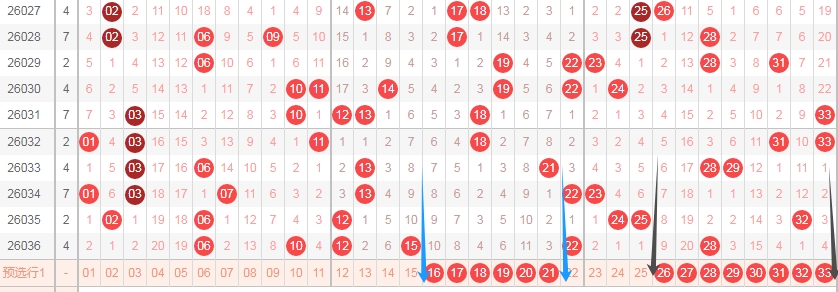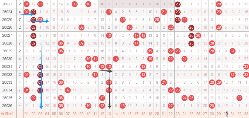 上图是福彩双色球红球开奖号码走势分布图,我标注出来的蓝色小箭头表示0字头数字连续11期没出现连号组合,看上面红球号码走势图中标注出来的横向蓝色小箭头连号组合0203,我标注出来的黑色小箭头表示1字头数字连续5期没出现连号组合,看上面红球号码走势图中标注出来的横向黑色小箭头连号组合1213。那么本期可以留意0字头数字出连号组合,或者1字头数字出连号组合。