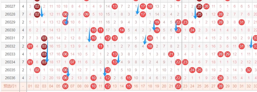 上图是福彩双色球蓝球开奖号码走势分布图,我标注出来的红色小箭头表示蓝球3尾数的数字03 13到本期为止蓝球3尾数的数字已经连续遗漏了9期,那么本期或者近期也是要留意蓝球3尾数的数字。