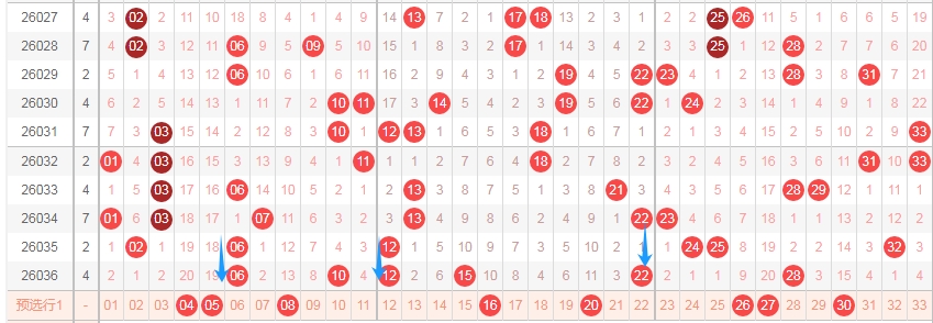 上图是福彩双色球红球开奖号码走势分布图,我标注出来的蓝色小箭头表示最近红球号码喜欢出重复号码,上期出现了两个重复号码06和12,那么本期可以继续关注出重复号码,那么上期开出的数字06 10 12 15 22 28本期可以关注出重复号码一个或者两个吧。