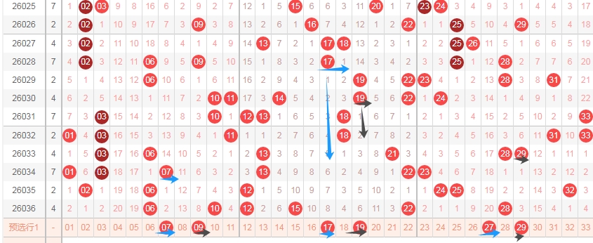 上图是福彩双色球红球开奖号码走势分布图,我标注出来的蓝色小箭头红球号码7尾数的数字07 17 27到本期为止7尾数数字连续遗漏了2期上次是连续遗漏了5期,那么本期这个7尾数的数字07 17 27可以关注出一个或者两个,标注出来的黑色小箭头表示9尾数数字,到本期为止9尾数数字连续遗漏了3期上次是连续遗漏了两期,那么本期9尾数数字开出的机会也是有的,本期关注09 19 29出一个或者两个,那么假设这两个尾数的数字出的话,那么本期0709 1719 2729这三组跨度二组合要留意一下。
