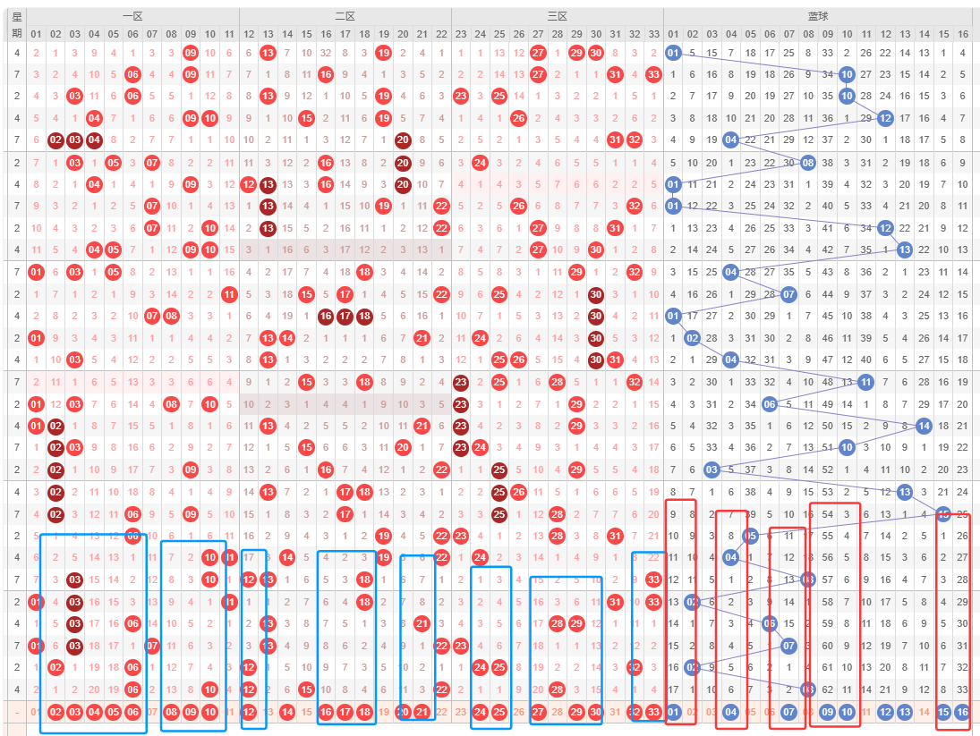 蓝球,历史同期频次最多的为14-16;近30期,频次最多的为1-4,明显特征是01路小优势;推荐重点1-2-4-6-8-10-12-13。
