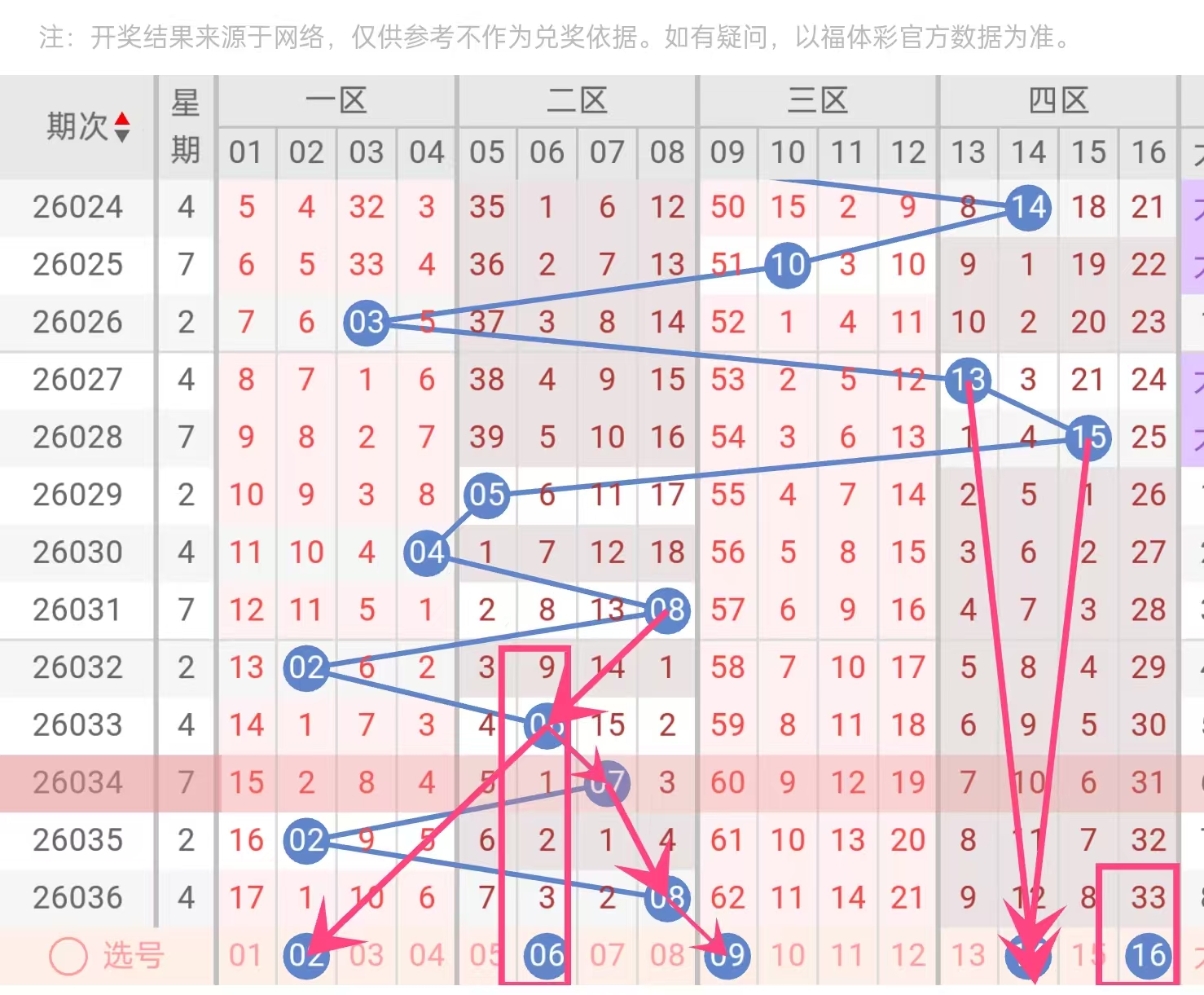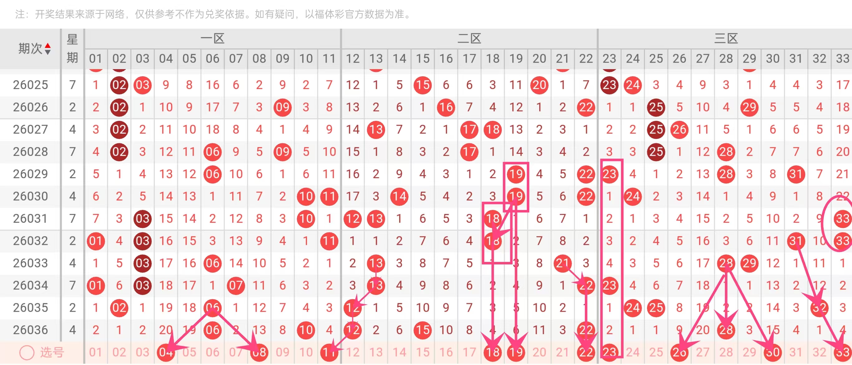 三区(23-33):选23、26、30、33。23近10期出现2次(2026030、2026032),遗漏2期;26近15期出现3次(2026016、2026028、2026033),上期出26,防重;30近30期出现5次(2026003、2026010、2026014、2026024、2026033),热号但可接受;33近20期出现4次(2026002、2026007、2026017、2026032),遗漏4期。