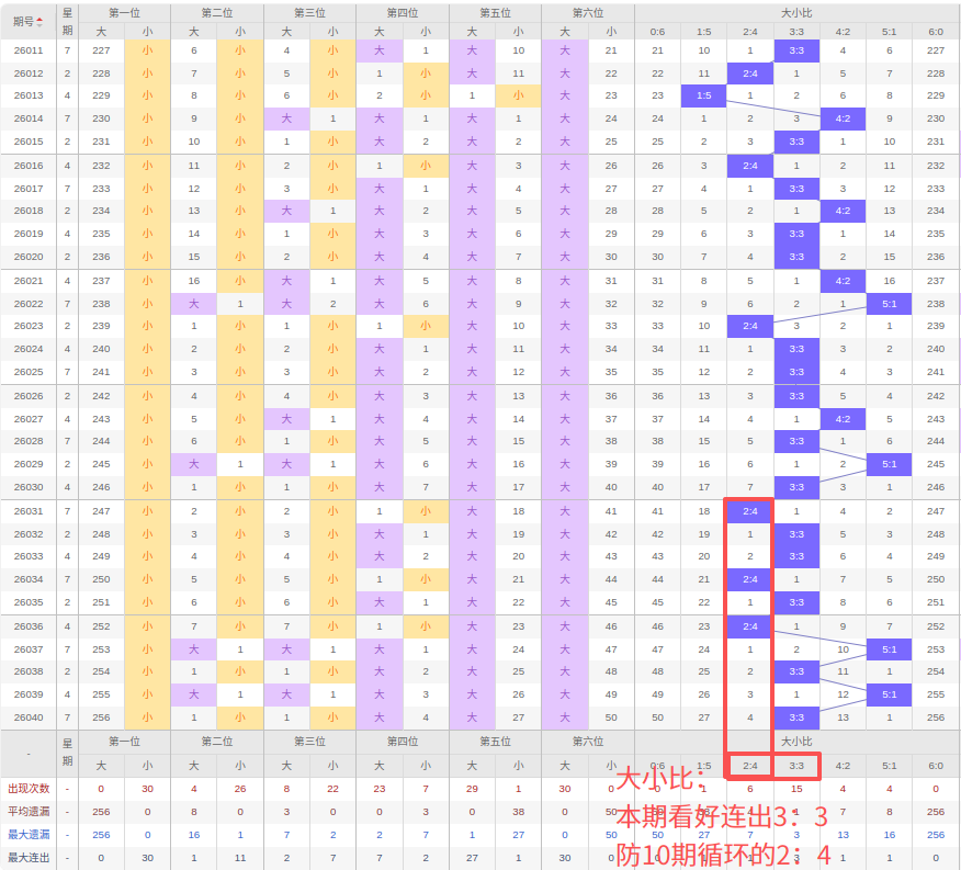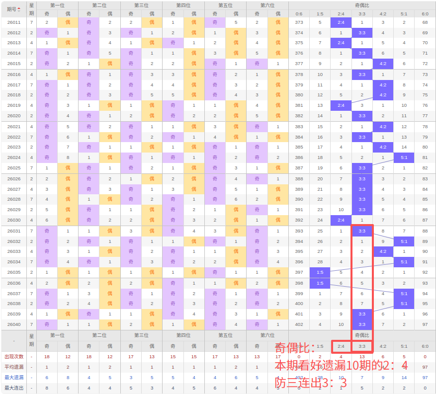 上期奇偶比:3:3,近10期奇偶比出现情况:3:3、5:1、4:2、5:1、1:5、1:5、5:1、5:1、3:3、3:3,最近10期出现3期3:3,出现1期4:2,出现0期2:4,出现4期5:1,出现2期1:5,出现0期6:0,出现0期0:6,根据近10期规律本期看好遗漏10期出2:4,防三连出的3:3,综上所述推荐奇偶比推荐:3:3,重点关注:2:4。