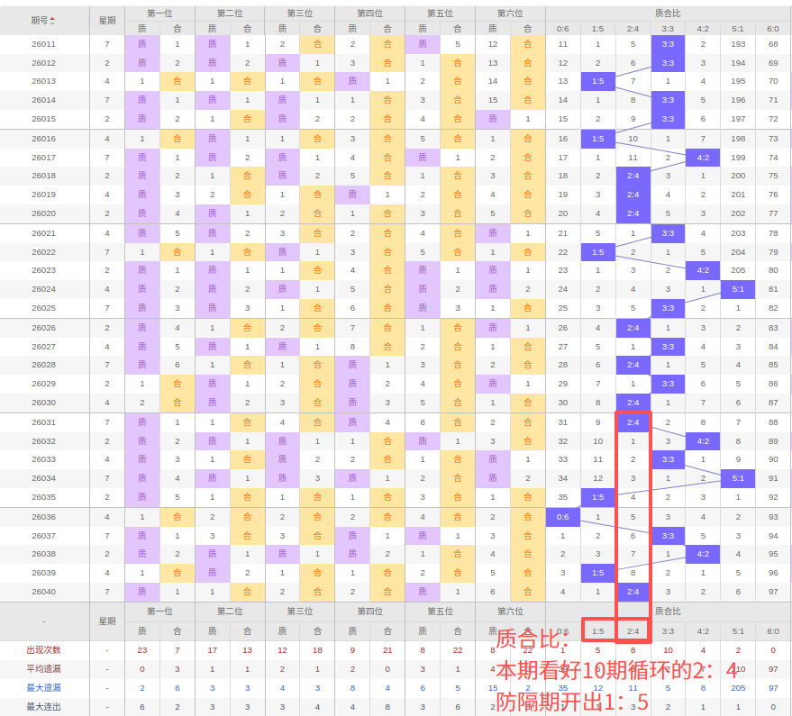 上期质合比:2:4,近10期质合比出现情况:2:4、4:2、3:3、5:1、1:5、0:6、3:3、4:2、1:5、2:4,最近10期出2期3:3,出现2期4:2,出现2期2:4,出现1期5:1,出现2期1:5,出现0期6:0,出现1期0:6,根据近10期规律本期看好10期循环出2:4,防隔期的1:5,综上所述推荐质合比推荐:1:5,重点关注:2:4。