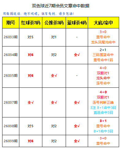 上期红球杀7码对6,公推杀3码对2,蓝球杀号全对。