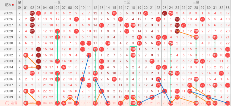 第三区间(23-33):三区上期开出号码25 30,近5期出号量3-1-4-3-2。本期三连号趋势,隔码斜连趋势24 33。近5期平均出2.6枚,平均出号增加。