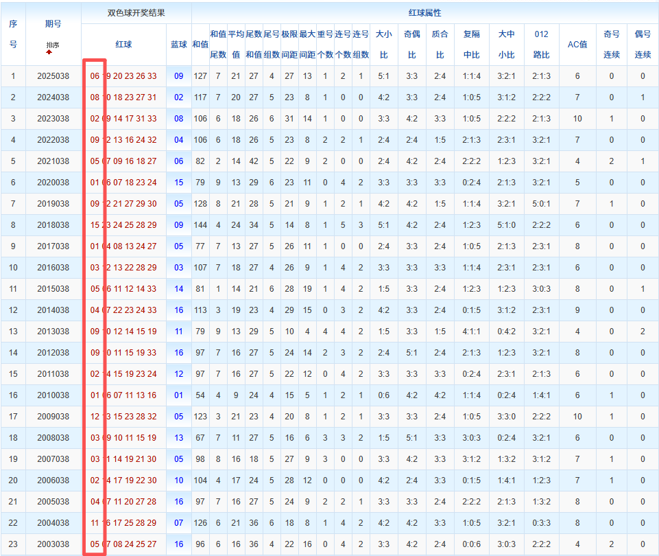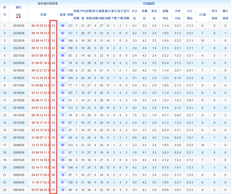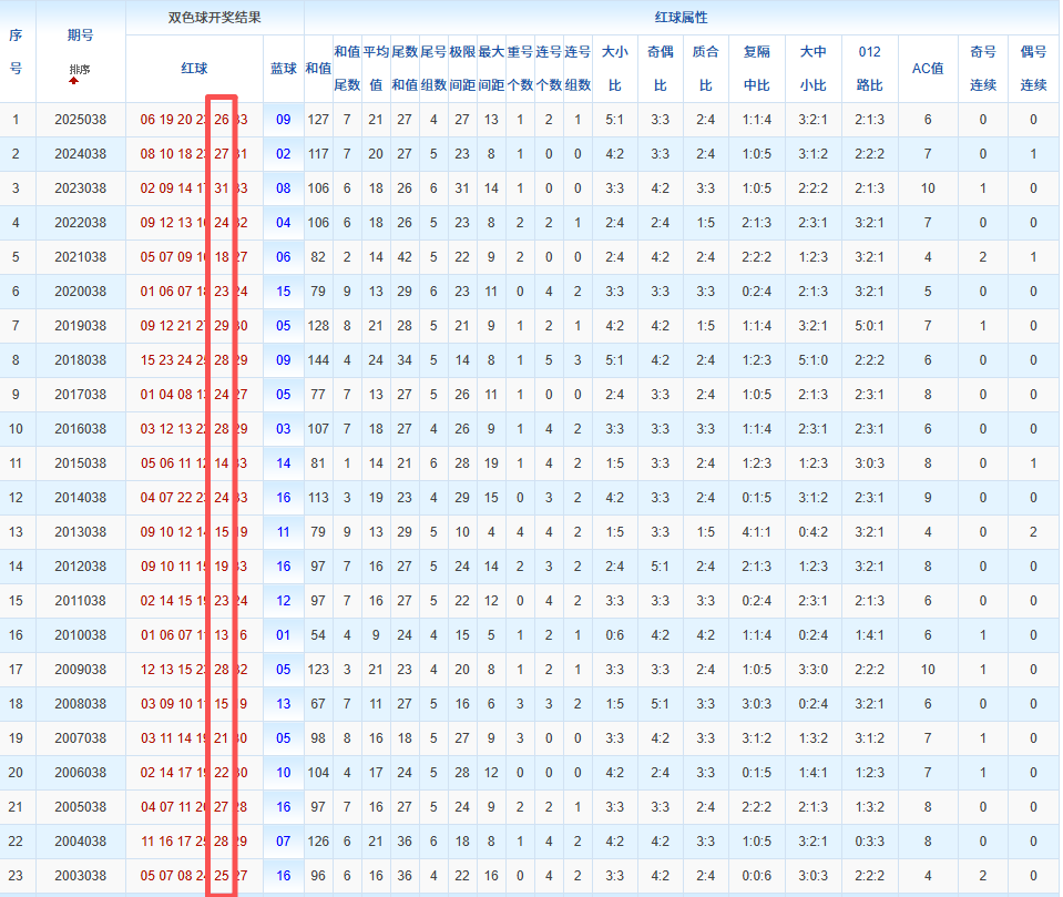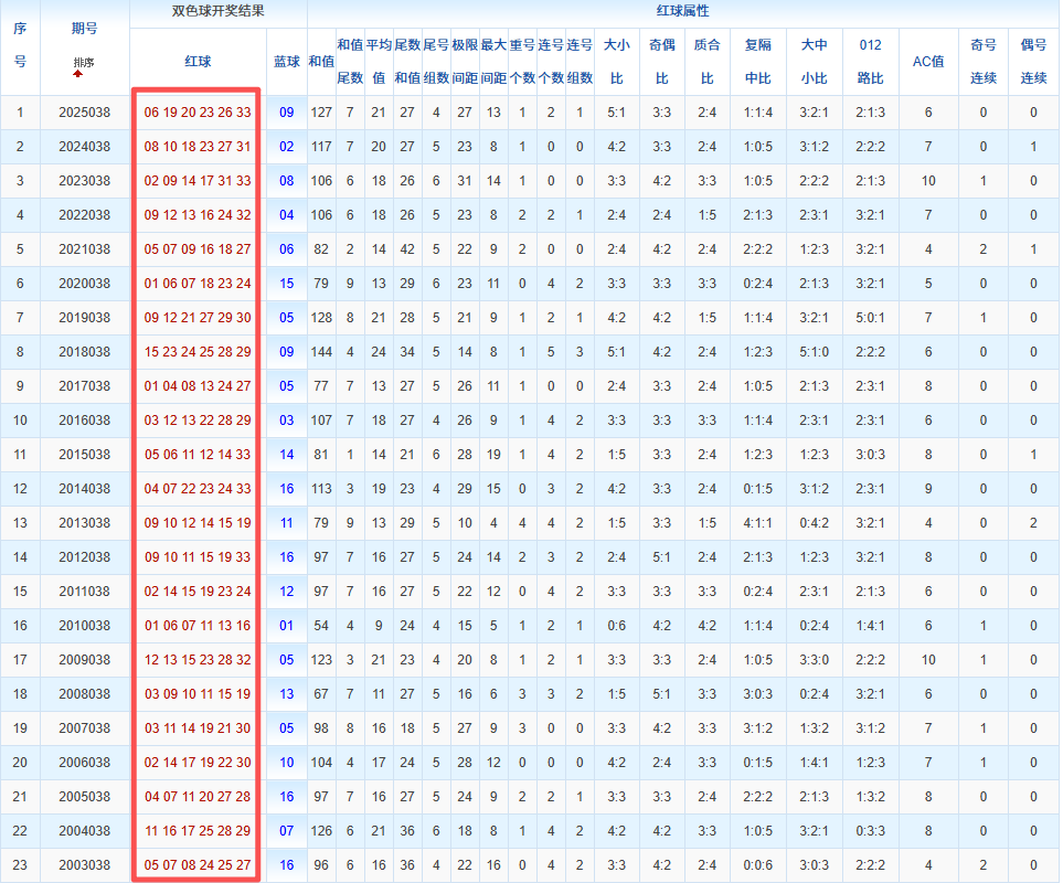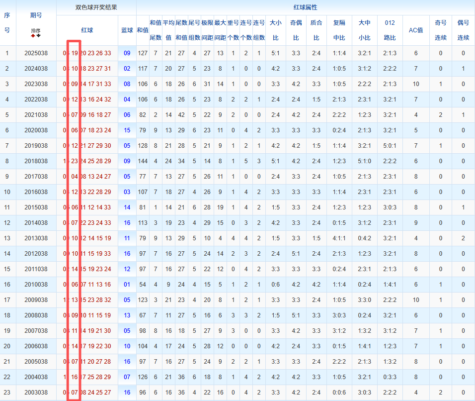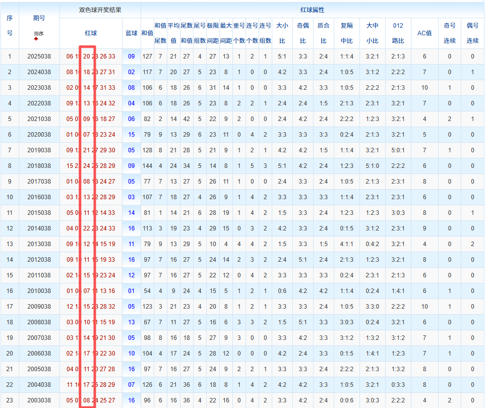 通过观察,我发现双色球往年同期的开奖数据与本期号码之间存在显著关联。具体来说,在红球中,从第一位至第六位,通常会有约4个位置上的数字与往年同期相同位置的号码一致;而蓝球号码中,也有多期开奖结果直接包含了往年同期的数字。因此,我们可以借助往年同期各位置上的号码,作为分析本期开奖情况的重要依据。在此基础上,还可结合往年同期的其他相关条件,进行综合性的号码组合推荐。