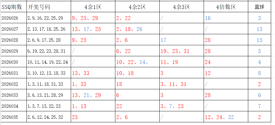 分享第一个数据分析:四分区统计数据。相对于传统的三分区,个人习惯使用四分区,就是把33个红球号码除以4,所得的余数分区如下: