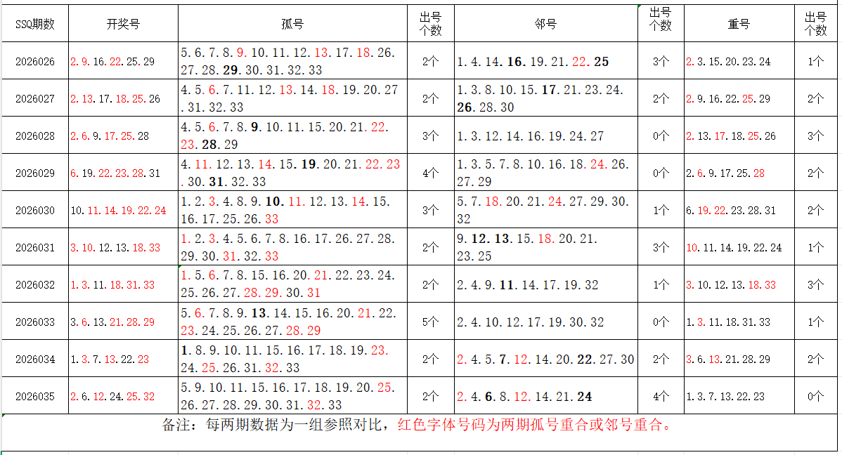 如图,以近两期数据为一组,进行对比分析。相同的孤号、邻号,可能在下期出1-4个左右。上期开出孤号2个,邻号4个,重号0个。本期参考孤号:4.8.9.10.14.15.16.17.18.19.20.21.22.27.28.29.30;邻号:1.3.5.7.11.13.23.26.31.33;孤、邻号重合号码精选:***(会员专区可见)。个人分析,仅供参考。