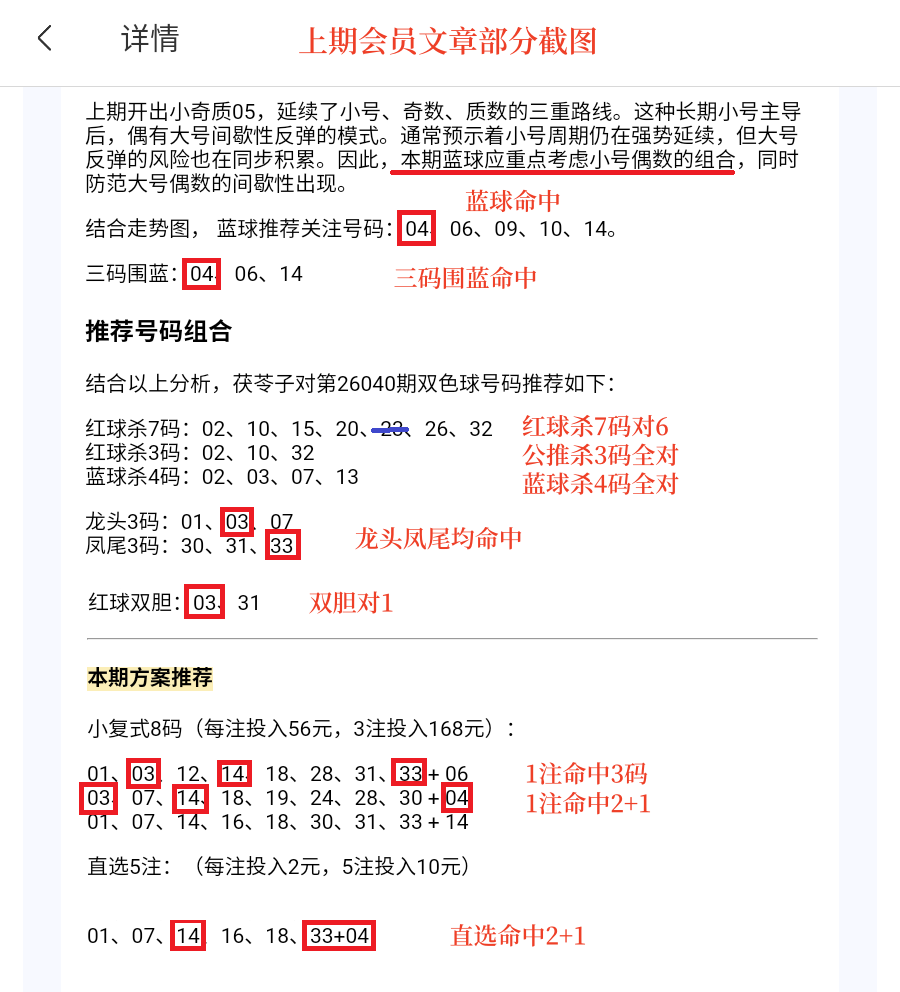 会员文章中龙头凤尾均命中,双胆对1,三码围蓝命中,8+1复式1注命中3码,1注命中2+1,直选命中2+1。
