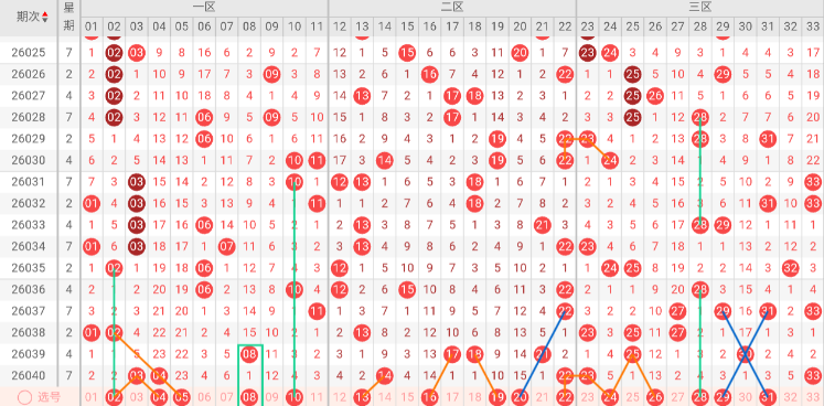 第三区间(23-33):三区上期开出号码23 33,近5期出号量1-4-3-2-2。本期无三连号趋势,隔码斜连趋势29 31。近5期平均出2.4枚,平均出号减少。