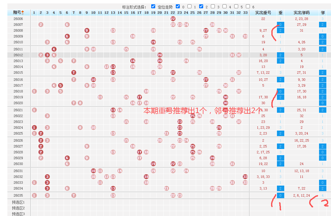 1、前区重号推荐:上期前区开出2个重号,近65期出号个数为:-1-0-1-1-0-0-0-0-2-1-1-0-0-0-0-0-0-1-0-0-0-0-1-2-1-2-2-2-2-2-2-2-0-0-0-0-2-3-1-2-1-1-1-1-1-1-1-1-2-2-2-2-2-2-2-0-0-0-0-0-0-0-1-0-1-0-2-1-1-1-1-1-1-2-2-2-1-3-2-1-0-2-1-2-1-1-3-2-1-2-3-2-2-1-3-1-2-0,根据出号规律出120后紧随出-1-0-2-1-0-1-1-0-0-0-0-2-1-1-1-0-1-2-1-1-1-2-1-2-0-0-1-0-0-0-1-1-1-1本期推荐出1个。