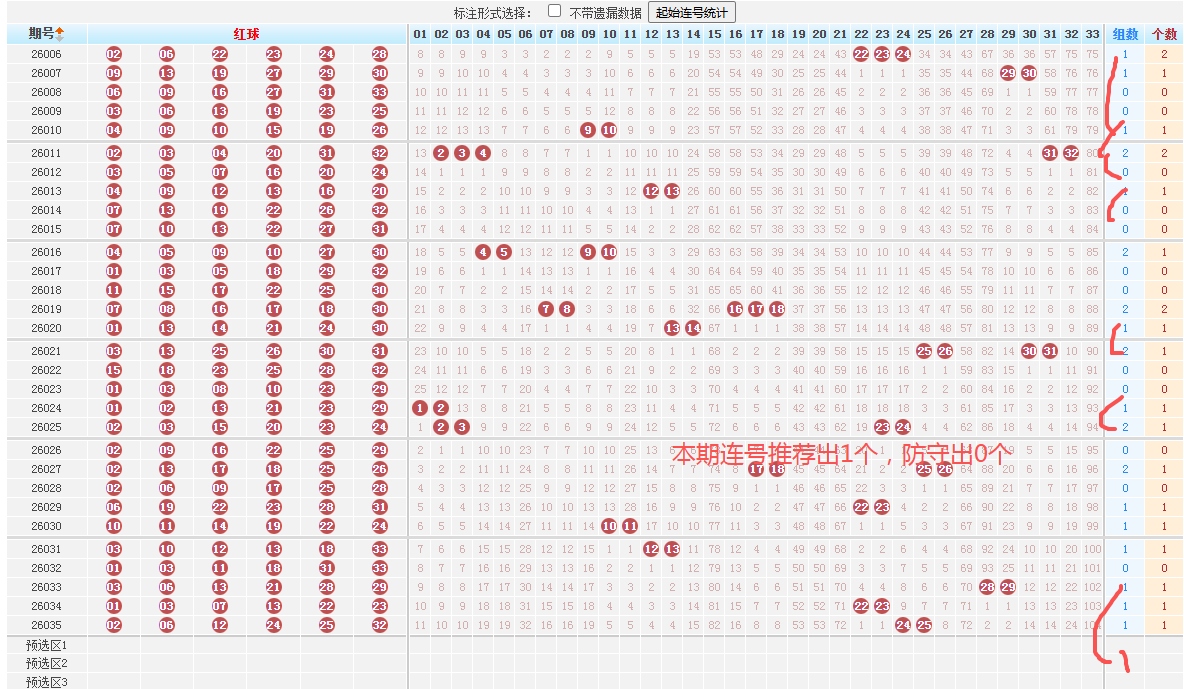 近10期数据显示,本期需注意03、06、 12、32等红球多次出现,整体趋势活跃,其中03、06多次出现,属于高频热号,热号居高不下,本期建议考虑03、04、06、、20、32作为重点参考。