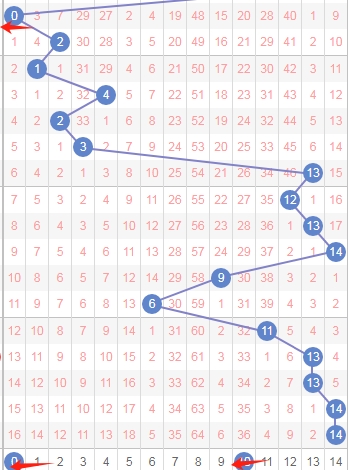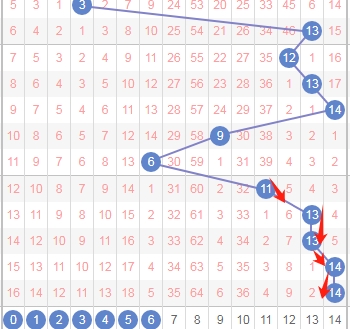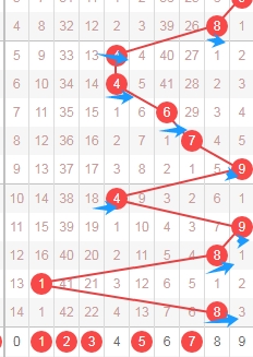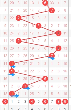 上图是体彩七星彩从左到右第六位数字,我标注出来的数字都是遗漏周期小的数字,标注出来的蓝色箭头看看,最近上面出现了几个遗漏周期大的数字,那么本期可以关注出遗漏周期小的数字012359,个人最看好数字0139。