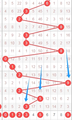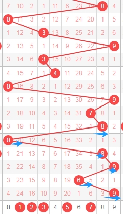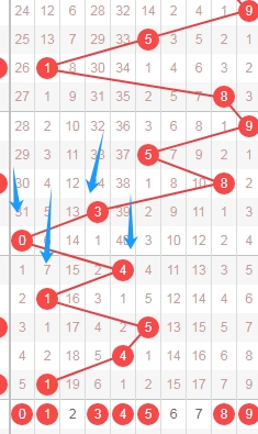 上图是体彩七星彩从左到右第四位数字,我标注出来的数字都是遗漏周期小的数字,标注出来的蓝色箭头看看,最近上面出现了几个遗漏周期大的数字,那么本期可以关注出遗漏周期小的数字0134589,个人最看好数字3458。