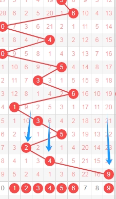 上图是体彩七星彩从左到右第五位数字,我标注出来的数字都是遗漏周期小的数字,标注出来的蓝色箭头看看,最近几期出现了几个遗漏周期大的数字,那么本期可以关注出遗漏周期小的数字1234569,个人最看好数字23569。