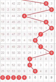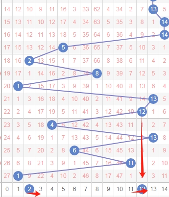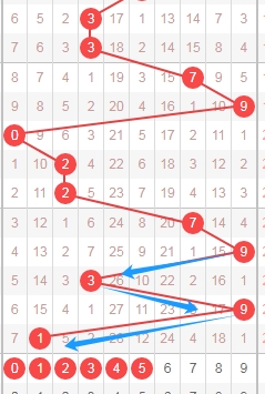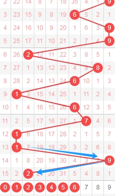 上图是体彩七星彩从左到右定位第六位数字,我标注出来的蓝色箭头表示跨度,上期开出数字1跨度是从数字9到数字1跨度是8,那么本期可以关注出走势跨度小的数字012345,个人最看好数字01245。