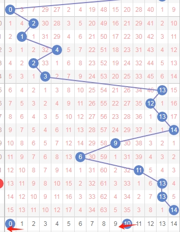 上图是体彩七星彩从左到右第二位走势图,我标志出来的蓝色箭头表示走势跨度,上期是数字8走数字1跨度是7,属于大跨度,那么本期可以关注出小跨度的数字012345,个人最看好数字0145。