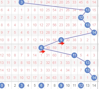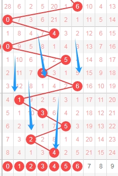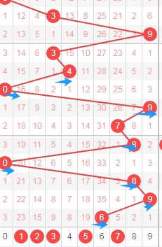 上图是体彩七星彩从左到右第五位走势图,我标志出来的蓝色箭头表示遗漏周期,很明显最近几期开出的数字遗漏周期大的有很多次,那么本期第五位数字可以关注出遗漏周期小的数字0123456,个人最看好数字01356。