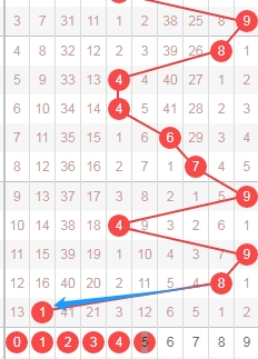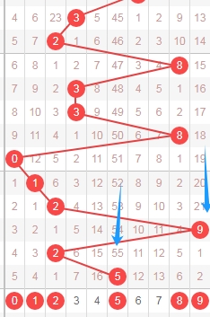 上图是体彩七星彩从左到右第六位走势图,上期开出数字5遗漏周期是55期,我标志出来的蓝色箭头表示遗漏周期,很明显最近几期开出的数字遗漏周期大的有很多次,那么本期第六位数字可以关注出遗漏周期小的数字012589,个人最看好数字0128。