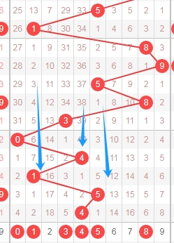 上图是体彩七星彩从左到右第四位走势图,我标志出来的蓝色箭头表示遗漏周期,很明显最近几期开出的数字遗漏周期大的有很多次,那么本期第四位数字可以关注出遗漏周期小的数字013458,个人最看好数字0358。