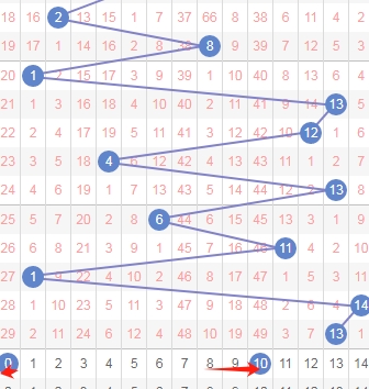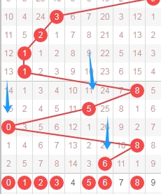 上图是体彩七星彩从左到右定位第四位数字,我标注出来的蓝色箭头表示遗漏周期,上期开出数字6遗漏周期是27期,根据最近几期的遗漏周期来分析,本期可以关注出遗漏周期小的数字0123568,个人最看好数字023568。