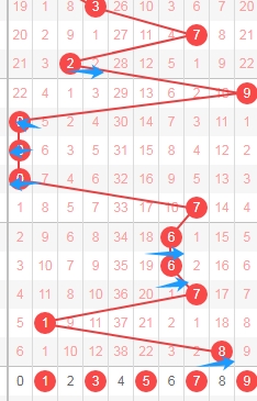 上图是体彩七星彩从左到右定位第二位数字,我标注出来的蓝色箭头表示遗漏周期,上期开出数字9遗漏周期是9期,上上期开出数字3遗漏周期是33期,那么本期可以关注出遗漏周期小的数字356789,个人最看好数字56789。