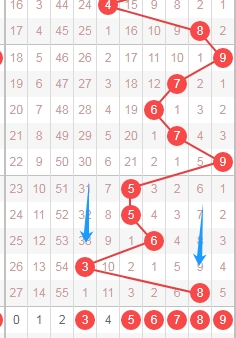 上图是体彩七星彩从左到右定位第三位数字,我标注出来的蓝色箭头表示质数数字,很明显最近7期开出了6期质数数字,那么本期可以关注出合数数字04689,个人最看好数字4689。