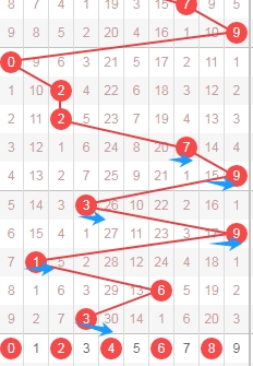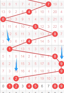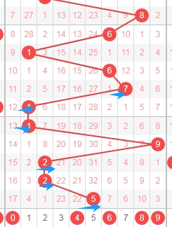 上图是体彩七星彩从左到右定位第六位数字,我标注出来的蓝色箭头表示奇数数字,很明显最近7期开出了6期奇数数字,那么本期可以关注出偶数数字02468,个人最看好数字0246。