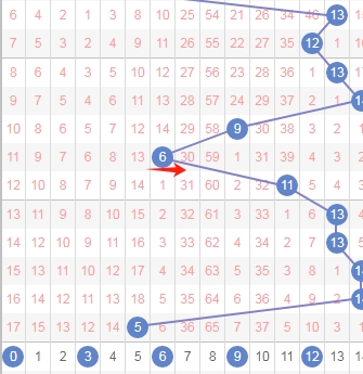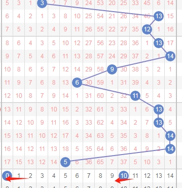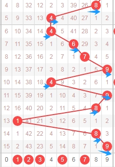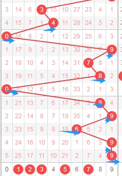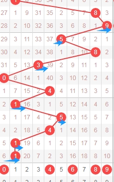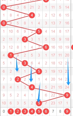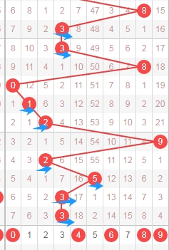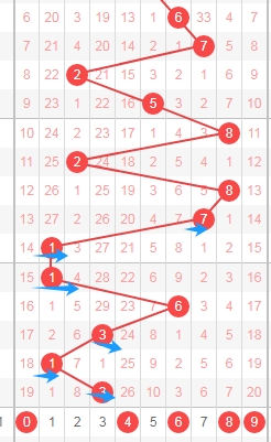 上图是体彩七星彩从左到右第六位数字,我标注出来的蓝色小箭头表示质数数字,很明显质数数字比较多,那么本期第六位数字可以关注出合数数字04689,个人最看好数字0469。