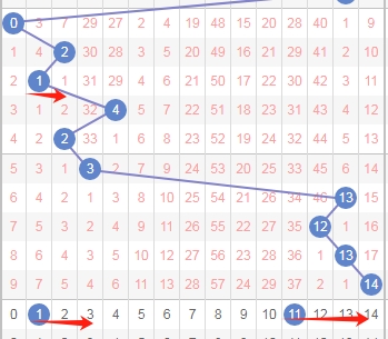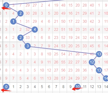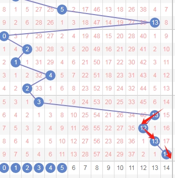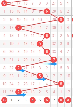 上图是体彩七星彩蓝球开奖号码走势分布图,我在上面走势图中标注出来的数字是我觉得可以看的范围,你们看看上面走势图中标注出来的红色小箭头表示最近开出的跨度走势,最近3期开出的蓝球跨度都是1,都是小跨度走势,那么本期可以关注出大跨度走势的数字,那么就是数字0 1 2 3 4 5。