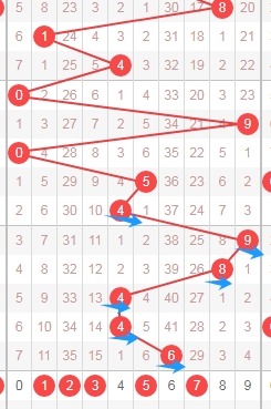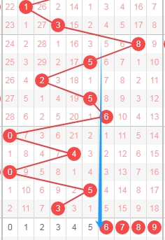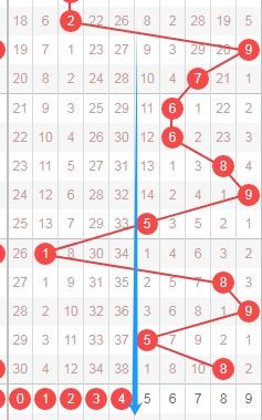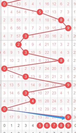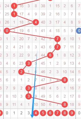 上图是体彩七星彩从左到右定位分析第六位数字走势图,我在上面走势图中标注出来的数字456789,因为上期开出的数字是从数字3到数字8跨度5,前面也出现了跨度5和跨度6,那么本期出小跨度数字的机会是有的,那么就是关注数字456789,个人最看好数字459。