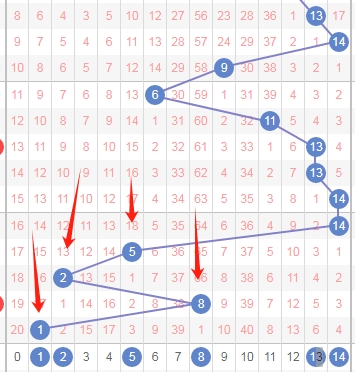 上图是体彩七星彩蓝球开奖号码走势分布图,我标志出来的红色箭头表示遗漏周期,上期开出数字1遗漏周期是17期,上上期开出数字8遗漏周期是66期,那么本期可以关注出遗漏周期小的数字1 2 5 8 13 14。