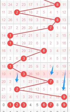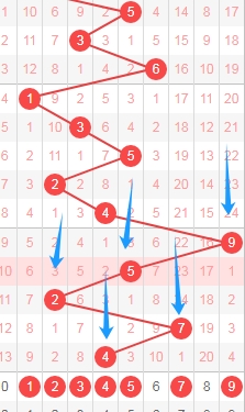 上图是体彩七星彩从左到右定位第五位数字走势图,我标志出来的蓝色箭头表示遗漏周期,上期开出数字4遗漏周期是4期,上上期开出数字7遗漏周期是24期,那么本期第五位数字可以关注出遗漏周期小的数字1234579,个人最看好数字12457。