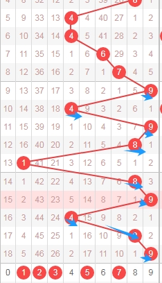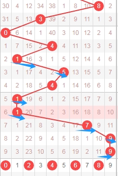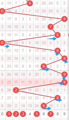 上图是体彩七星彩从左到右定位第六位数字走势图,我标志出来的蓝色箭头表示遗漏周期,上期开出数字0遗漏周期是9期,根据这些遗漏周期分析,本期第六位数字可以关注出遗漏周期小的数字023579,个人最看好数字0237。