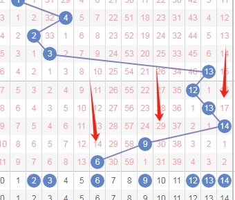 上图是体彩七星彩蓝球开奖号码走势分布图,我在上面标注出来的红色箭头标注遗漏周期,上期开出数字6遗漏周期是14期,上上期开出数字9遗漏周期是24期,那么根据这些遗漏周期来分析的话,本期蓝球出遗漏周期小的数字机会是有的,关注数字2 3 6 9 12 13 14。