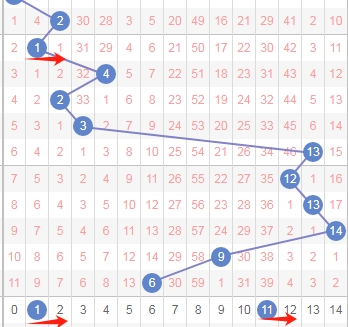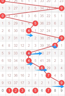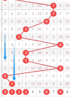 上图是体彩七星彩开奖号码从左到右定位第一个数字走势图,我标注出来的蓝色箭头左边的数字最近两期没出现号码,最近十几期出号码也不是很多,那么本期就关注这些数字01234,个人最看好数字0134。