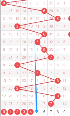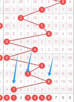 上图是体彩七星彩开奖号码从左到右定位第六个数字走势图,我标注出来的蓝色箭头表示遗漏周期,上期开出数字1遗漏周期是12期,上上期开出数字0遗漏周期是9期,那么根据这些遗漏周期来分析的话,本期第四位数字关注遗漏周期小的数字012368,个人最看好数字268。
