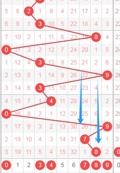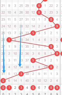 上图是体彩七星彩开奖号码从左到右定位第四个数字走势图,我标注出来的蓝色箭头表示遗漏周期,上期开出数字0遗漏周期是31期,上上期开出数字3遗漏周期是34期,那么根据这些遗漏周期来分析的话,本期第四位数字关注遗漏周期小的数字013589,个人最看好数字039。