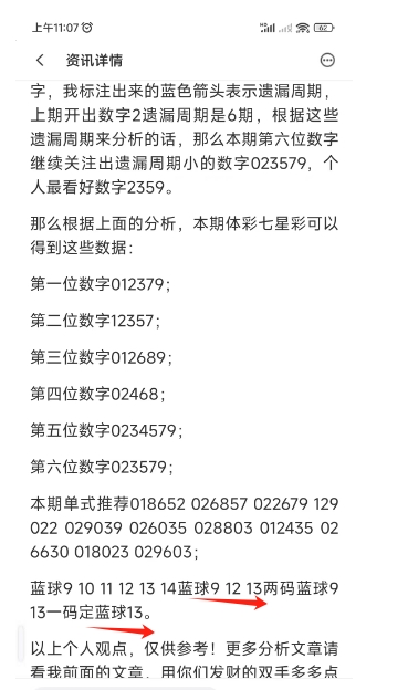 上图是上期体彩七星彩号码分析文章截图,我最后三码猜对蓝球12,可惜的就是最后一码定蓝球13开出的是12,这个你们去看上期的号码分析文章吧。