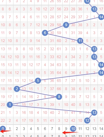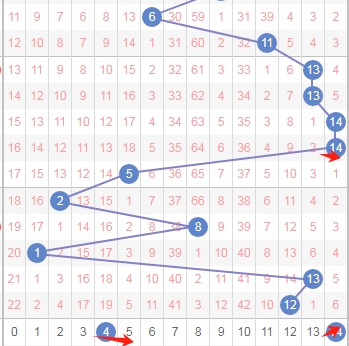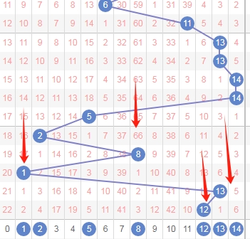 上图是体彩七星彩蓝球开奖号码走势分布图,我标注出来的红色箭头是遗漏周期,上期开出数字12遗漏周期是14期,根据这些遗漏周期来分析的话,本期可以关注遗漏周期小的数字1 2 5 8 12 13 14。