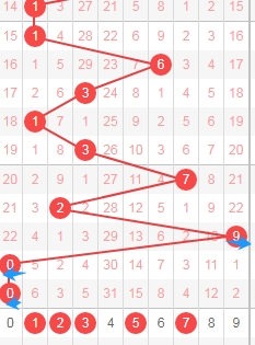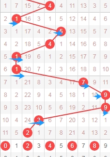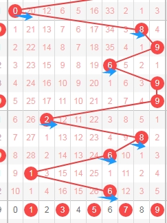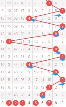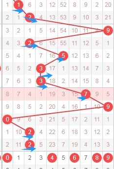 上图是体彩七星彩从左到右定位第六位数字,我标注出来的蓝色小箭头表示质数数字,很明显质数数字多,最近两期又开出了两期质数数字,那么本期第六位数字可以关注出合数数字04689,个人最看好数字4689。