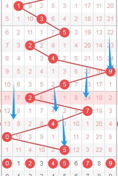 上图是体彩七星彩从左到右定位第五位数字,我标注出来的蓝色小箭头表示遗漏周期,最近几期没出现过遗漏周期小的数字,那么本期可以关注出遗漏周期小的数字024579,个人最看好数字2579。