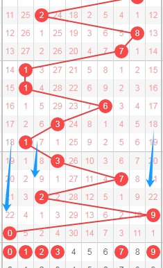 上图是体彩七星彩从左到右定位第三位数字,我标注出来的蓝色箭头表示遗漏周期,上期开出数字1遗漏周期是28期,那么本期可以关注遗漏周期小的数字012689,个人最看好数字01289。