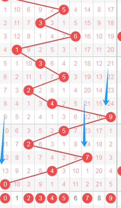 上图是体彩七星彩从左到右定位第五位数字,我标注出来的蓝色箭头表示遗漏周期,上期开出数字0遗漏周期是13期,根据这些遗漏周期来分析的话,那么本期第五位数字继续关注出遗漏周期小的数字0234579,个人最看好数字02479。